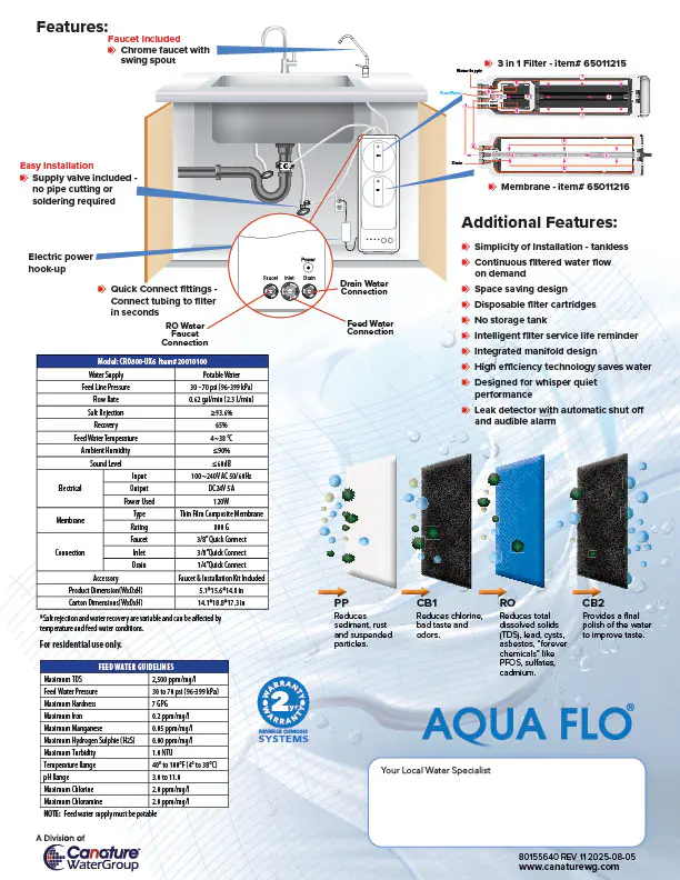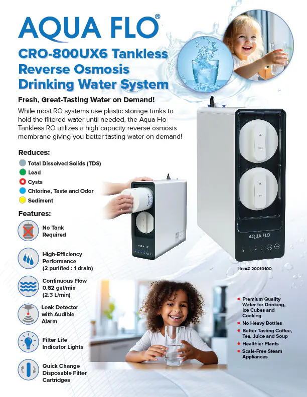 While most reverse osmosis (RO) systems use plastic storage tanks to hold the filtered water until needed, the new Aqua Flo tankless reverse osmosis system saves space while still providing you better tasting water on demand. It utilizes a high capacity reverse osmosis membrane giving you fresh tasting water without the need for a large storage tank taking up space under your sink.